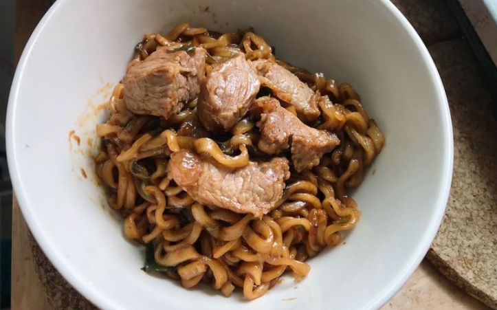 Evde ram-den hazırlamak için sadece Chapagetti ve Neoguri’yi karıştırın, ardından üzerine sığır filetosu bifteği koyun ve isterseniz doğranmış yeşil soğanla süsleyin.
