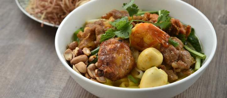 Bu Vietnam klasiği, az miktarda lezzetli et suyu ve muz çiçekleri, marul, kişniş, yeşil soğan ve Vietnam kişnişi gibi çıtır taze sebzeler ve otlar ile servis edilen düz pirinç eriştesi ve sarı yumurta eriştesinin bir kombinasyonundan oluşur.