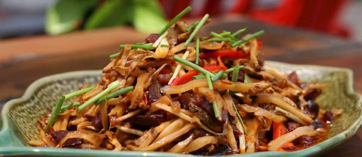 Ağaca tırmanan karıncalar olarak bilinen ve alışılmadık bir şekilde adlandırılan Sichuan yemeği, öğütülmüş domuz eti ile lezzetli bir sosta cam eriştelerden oluşur. İsim, cam eriştelerin ağaç dallarını temsil ettiği, doğranmış yeşil soğanın yaprakları temsil ettiği ve öğütülmüş domuz eti parçalarının karıncaları temsil ettiği yemeğin görsel görünümünden türetilmiştir.