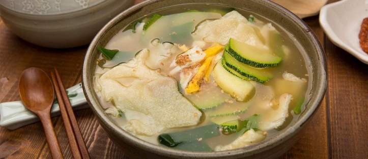 Elde çekilmiş buğday eriştesi, bu doyurucu Kore çorbasının ana bileşenidir. Et suyu geleneksel olarak ançuez, kuru deniz yosunu ve ara sıra kabuklu deniz ürünleri ile tatlandırılırken, ek elementler taze soğan ve patates gibi dilimlenmiş sebzeleri veya kimchi içerebilir.