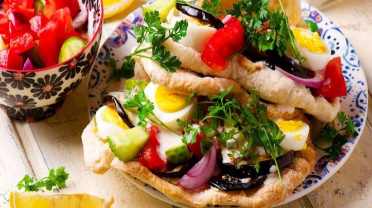 Pita ekmeklerini ortadan ikiye kesin ve içerisine humus sürün. Daha sonra kızarmış patlıcanları, haşlanmış yumurtaları, tahini ve salata karışımını ekleyin.