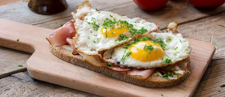 Her bir çavdar ekmeği dilimini bir tabağa koyun. Üzerine bir dilim kızarmış jambon veya pastırma yerleştirin ve bir tavuk yumurtası ile tamamlayın.