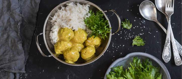 Köri soslu köfteleri haşlanmış pirinçle servis yapın.