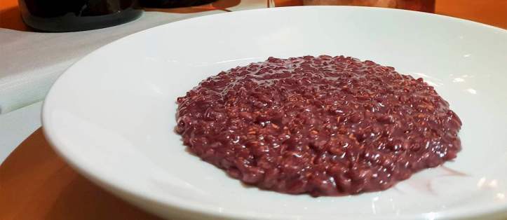 Risotto al vino rosso, İtalya genelinde hazırlanan klasik, zengin, kırmızı şarap aromalı bir risottodur. Temel formunda tereyağı, ince doğranmış soğan, pirinç, et suyu ve tabii ki kırmızı şarapla yapılan basit bir risottodur. Yemekte kullanılan şarap bir bölgeden diğerine değişir, ancak herhangi bir iyi, tam gövdeli, sek kırmızı şarap iyi sonuç verecektir.