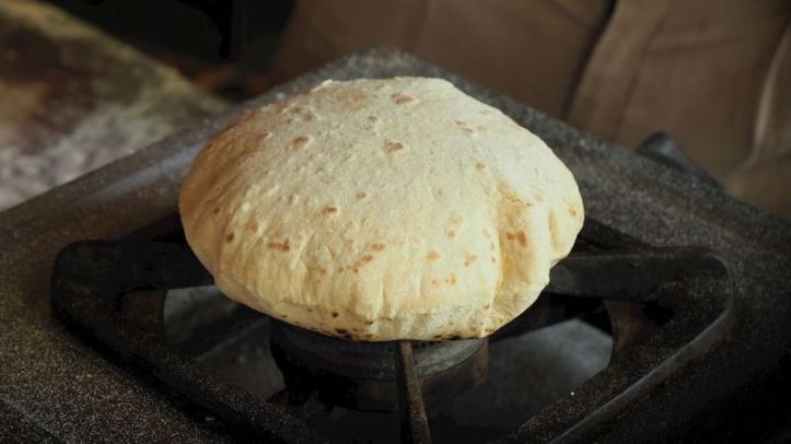 Birkaç saniye sonra alevi yüksek ateşe getirin; maşa kullanarak phulka hamurunu tavadan alın ve doğrudan alevin üzerine yerleştirin. Hamur küresel bir şekle dönüşmeli ve kabarmalıdır. Buna phulka denir.