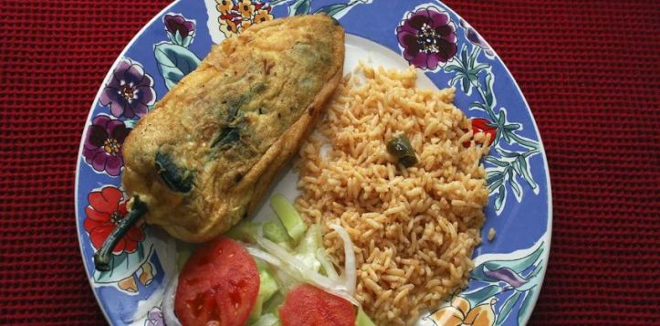 Chile relleno, Puebla şehrinde kökenleri olan bir Meksika yemeğidir. Peynir, fındık, tarçın ve doğranmış et gibi malzemelerle doldurulmuş acı biberlerden oluşur. Biberler doldurulduktan sonra genellikle yumurta ve una batırılır, ardından kızgın yağda kızartılır.