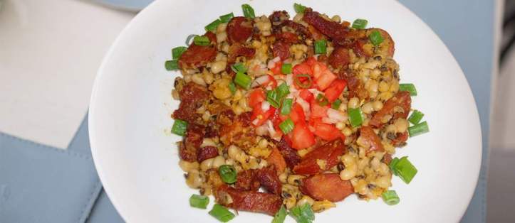 Büyük bir karıştırma kabında haşlanmış ve süzülmüş siyah göz fasulyesini, doğranmış domatesleri, soğanı, sarımsağı, yeşil biberi ve kırmızı biberi karıştırın.