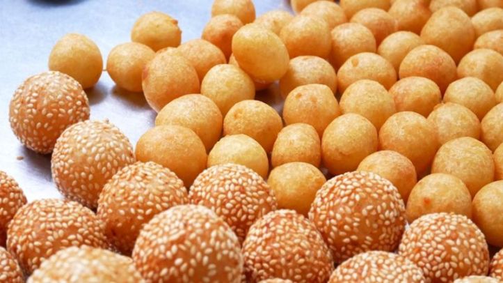 Bánh Cam toplarını beyaz susam tohumlarında yuvarlayın ve her bir topun tamamen susamlarla kaplanmasını sağlayın.
