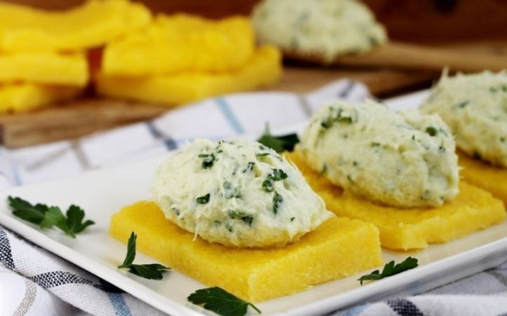 Polentayı dikdörtgenler halinde kesin (yaklaşık 5 cm x 10 cm) ve her iki taraftan kızartın (ızgara altında veya tavada).