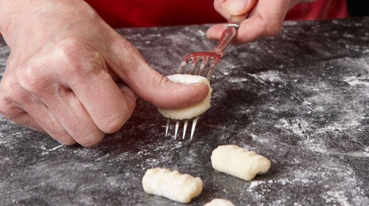 Hamur Yapımı: Büyük bir tencerede patatesleri yumuşayana kadar kaynatın, tencereden çıkarın ve soğumaya bırakın. Daha sonra patates rendesinden geçirin. Un ve tuzu karıştırıp düz bir zemine alın, ortasını açıp patates ve yumurtayı ekleyin, parmaklarınızla karıştırarak yumuşak bir hamur elde edin, elinize yapışmaması gerekiyor. Hafifçe unlanmış bir yüzeyde, küçük miktarlarda hamurları ipler oluşturacak şekilde kesin ve 2 cm parçalar halinde kesin, ardından her bir parçayı bir çatal üzerinde kaydırın ve biraz sıkın (ama çok sert değil). Biraz un serpin ve birbirine yapışmaması için karıştırın. Gnocchi’yi pişirmeden önce 20 dakika dinlendirin.