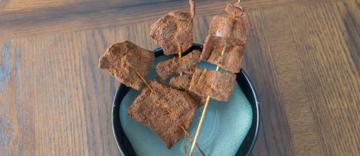 Baharatlı et dilimlerini şişlere geçirin.