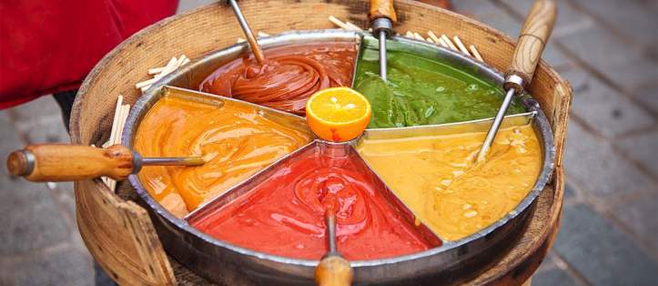 Bu alışılmadık Türk tatlısı genellikle sokak satıcıları tarafından ayrı bölmeli küçük tepsilerde hazırlanır. Her bölme kalın, renkli şekerleme hamuruyla doldurulur ve satıcı daha sonra tahta bir çubuğun etrafına sararak bir çeşit çok renkli lolipop oluşturur.