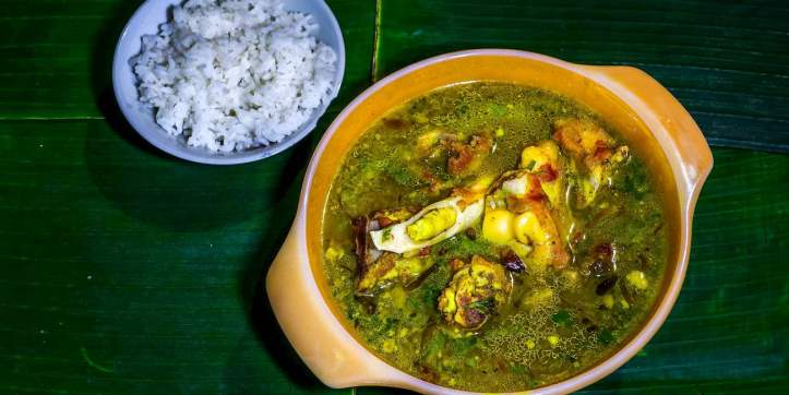 Kemikler, zerdeçal, havlıcan, limon otu, kimyon, kişniş, sarımsak ve soğan gibi çeşitli otlar ve baharatlarla zenginleştirilmiş, hindistancevizi sütü bazlı ince bir et suyunda pişirilirken, bazı tarifler keçi iç organlarının eklenmesini de içerebilir.