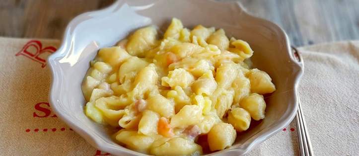 Özellikle soğuk kış günlerinde popüler olan makarna e patateye, ideal olarak servis öncesi rendelenmiş peynir serpilir.