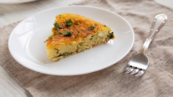 Sertleşince makarnalı omletin diğer yüzü çevrilir ve altın rengi olana kadar pişirilir. Bu makarnalı omlet, henüz sıcakken hemen servis edilir. Artık pişmiş makarnayı kullanmanın harika bir yoludur. Ispanak, salam ve yeşil soğan gibi malzemeler de dahil olmak üzere birçok varyasyon vardır.