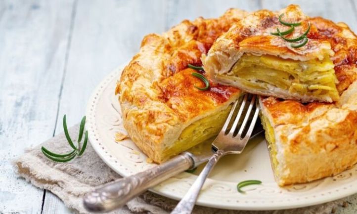 Patates karışımını hamurun üzerine yayın ve düzgün bir şekilde dağıtın. İkinci hamur parçasını üzerine yerleştirin ve alttaki hamur ile kenarlarını iyice kapatın.
