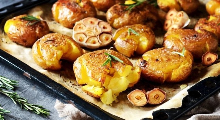 Patatesler soğuduktan sonra, her birini hafifçe ezerek yassılaştırın ve yağlı kağıt serili fırın tepsisine yerleştirin.