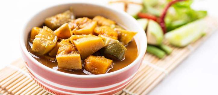 Balık parçalarını, bambu filizlerini, yeşil fasulyeleri ve Tay patlıcanlarını tencereye ekleyin. Balık tamamen pişene ve sebzeler yumuşak ama yine de gevrek olana kadar yaklaşık 5 dakika pişirin.