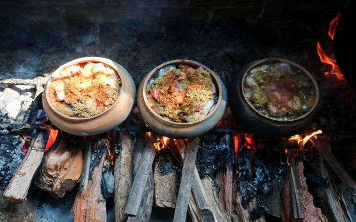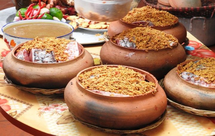 Zencefil, arpacık soğanı, pul biber ve havlıcan ince ince kıyılıp karıştırılır, kalan havlıcan ince dilimler halinde kesilir ve toprak bir tencereye konur. Havlıcan dilimleri balık, kalın domuz göbeği dilimleri ve ince kıyılmış zencefil, arpacık soğanı, havlıcan ve biber karışımı ile doldurulur.