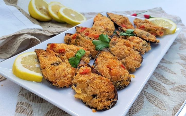 Midyeli yarım kabuklar daha sonra üzerine maydanoz, kekik ve sarımsak serpilmiş bir kızartma tavasına konur. Midyeler birkaç dakika fırınlanmadan önce zeytinyağı gezdirilir ve galeta unu serpilir, karabiberle tatlandırılır ve servis edilir.