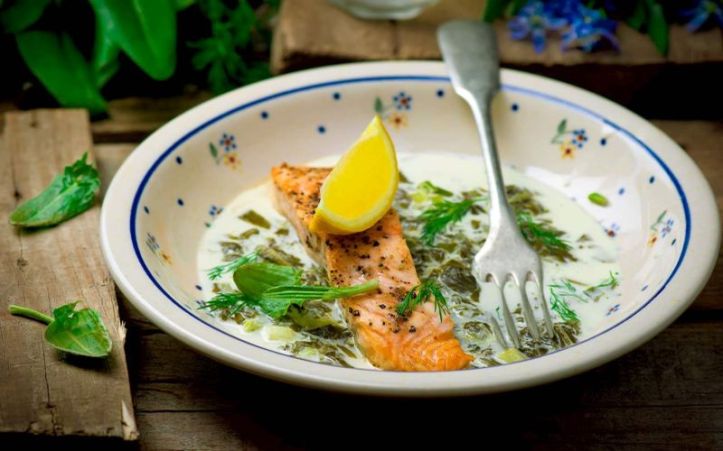 Saumon à L’oseille’i süslemek için limon dilimleri ve ilave kuzukulağı yapraklarıyla servis edin.