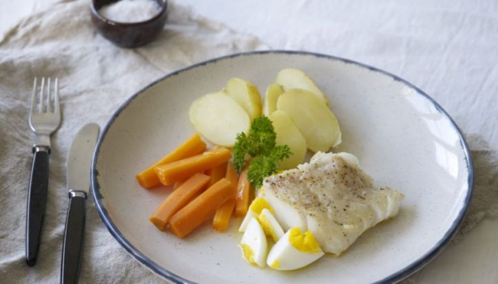 Servis yapmak için morina filetolarını haşlanmış patates ve havuçla birlikte tabaklara koyun. Sosu balık ve sebzelerin üzerine dökün.